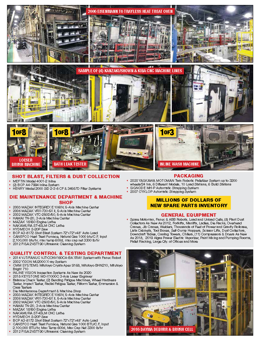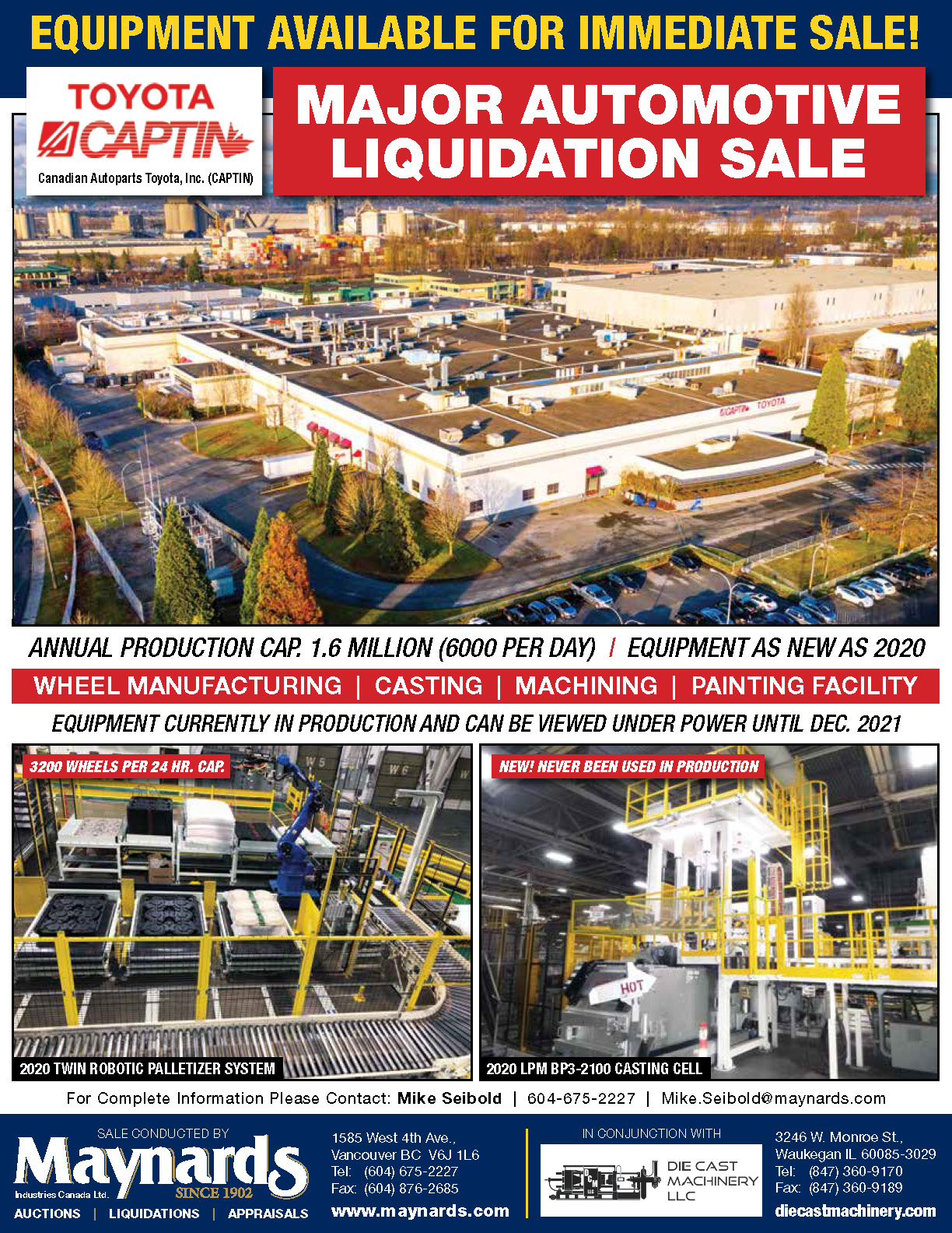 Die Cast Machinery, LLC with its partner Maynards Industries announces the total liquidation of assets belonging to Toyota Captin - Canadian Autoparts Toyota Inc. in Delta, British Columbia, Canada. Major equipment includes LPM BP3-2100 TC Low Pressure Die Casting Cell new in 2020, BCP Shot Blast Machines, Dust Collection System, Heat Treat Oven and Furnaces, CNC Machines, Yxlon X-ray and much more...